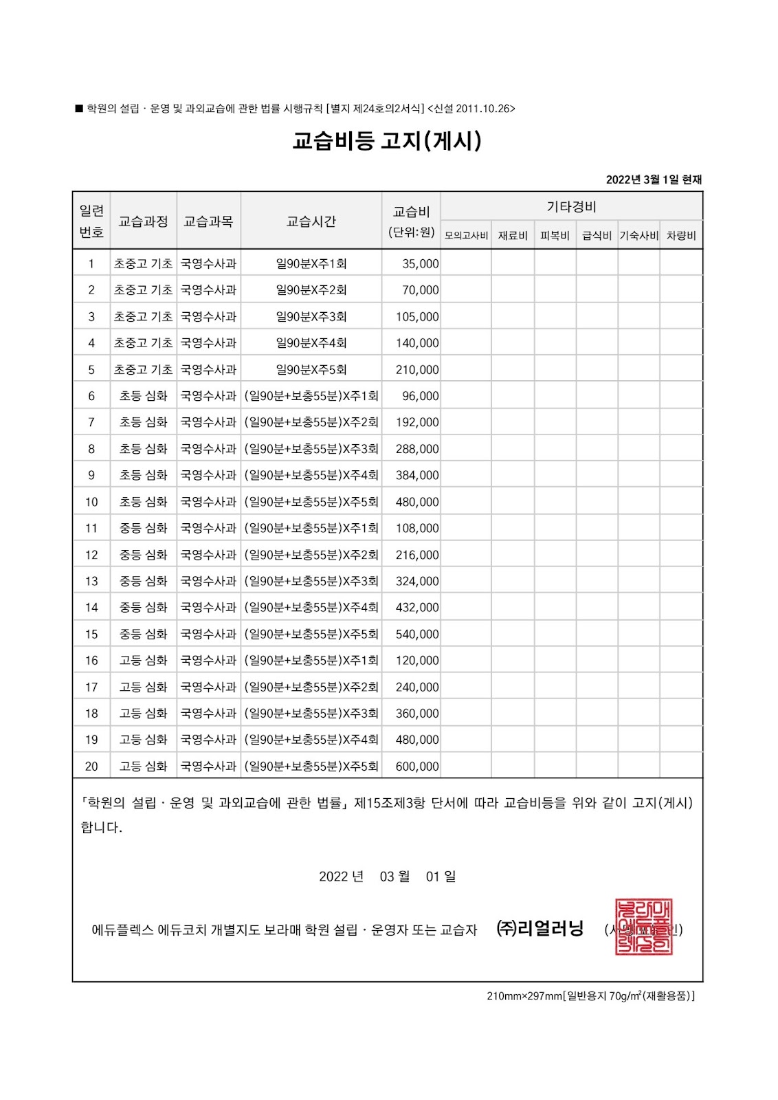 [ 수강료 게시표 ]